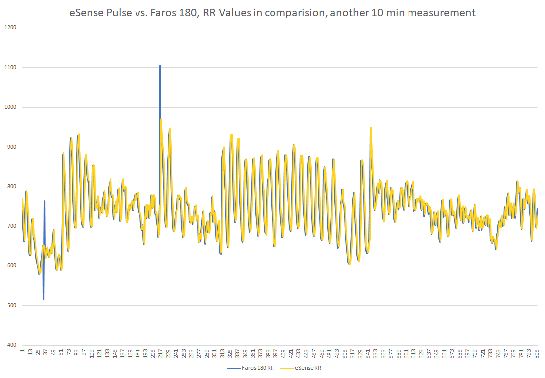Our eSense Pulse is especially suitable for short measurements. For long-term measurements we also have the Faros 180 in our assortment. We have done a 10-minutes measurment with both devices for comparison. You see a high precision and consistency of the data collected in parallel on a person. The graphs are so exactly on top of each other that the graph below in blue is barely visible: